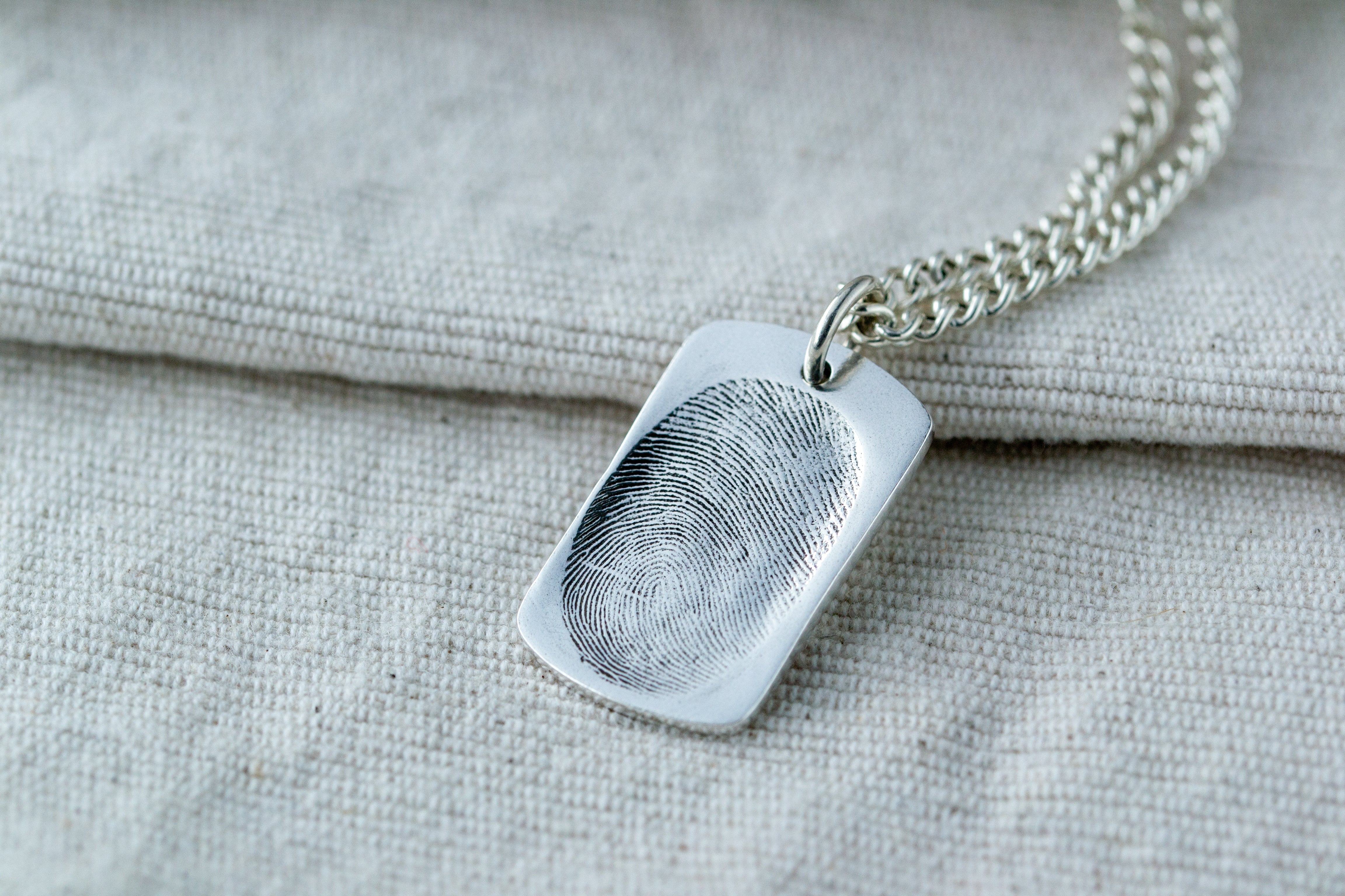 Prefer a longer, elegant chain to showcase your unique fingerprint jewellery? Capture your baby's actual fingerprint in sterling silver, equally meaningful for adults. Get the impression done by a local jeweller or use our moulding kit at home to create the perfect pendant. Choose from various shapes, with a hand-engraved name and age included. Complete your piece with one of our Italian-made, slinky sterling silver curb chains, available in two sizes, and optionally add a birthstone for a personalised touch.