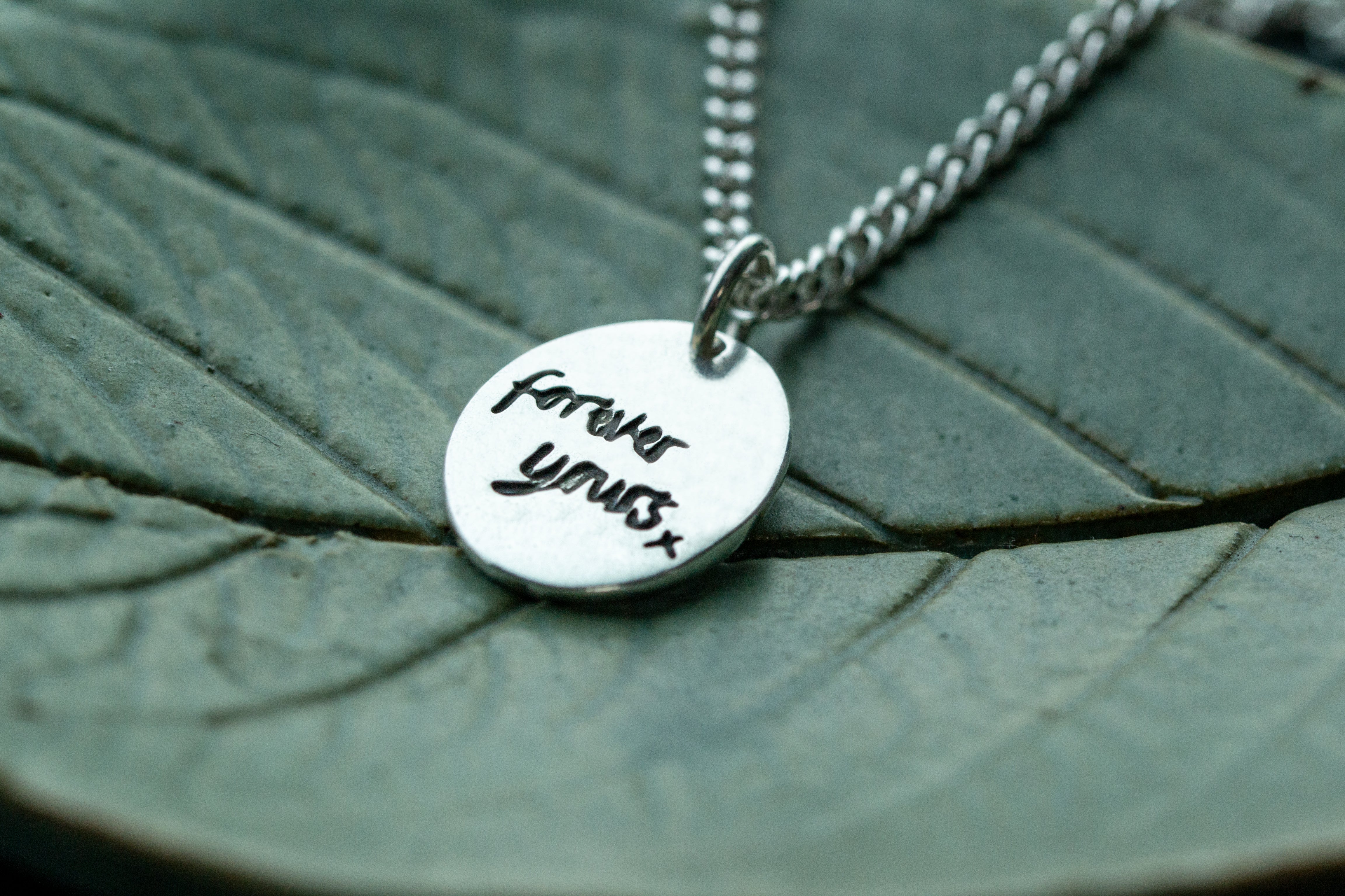 If you prefer a longer chain or are looking for a chain that's perfect "for him," this could be the ideal choice! Our sterling silver pendant, featuring custom handwriting jewellery, captures an original handwritten name or phrase on one side, with a name and age engraved on the reverse. Each pendant is handmade and elegantly attached to one of our sleek, Italian-made curb chains. To create your personalised piece, simply take a clear picture of the handwriting and upload it with your order. Choose from a variety of pendant shapes to suit your style. Your unique handwriting jewellery will be delivered beautifully packaged, complete with a polishing cloth and care advice.