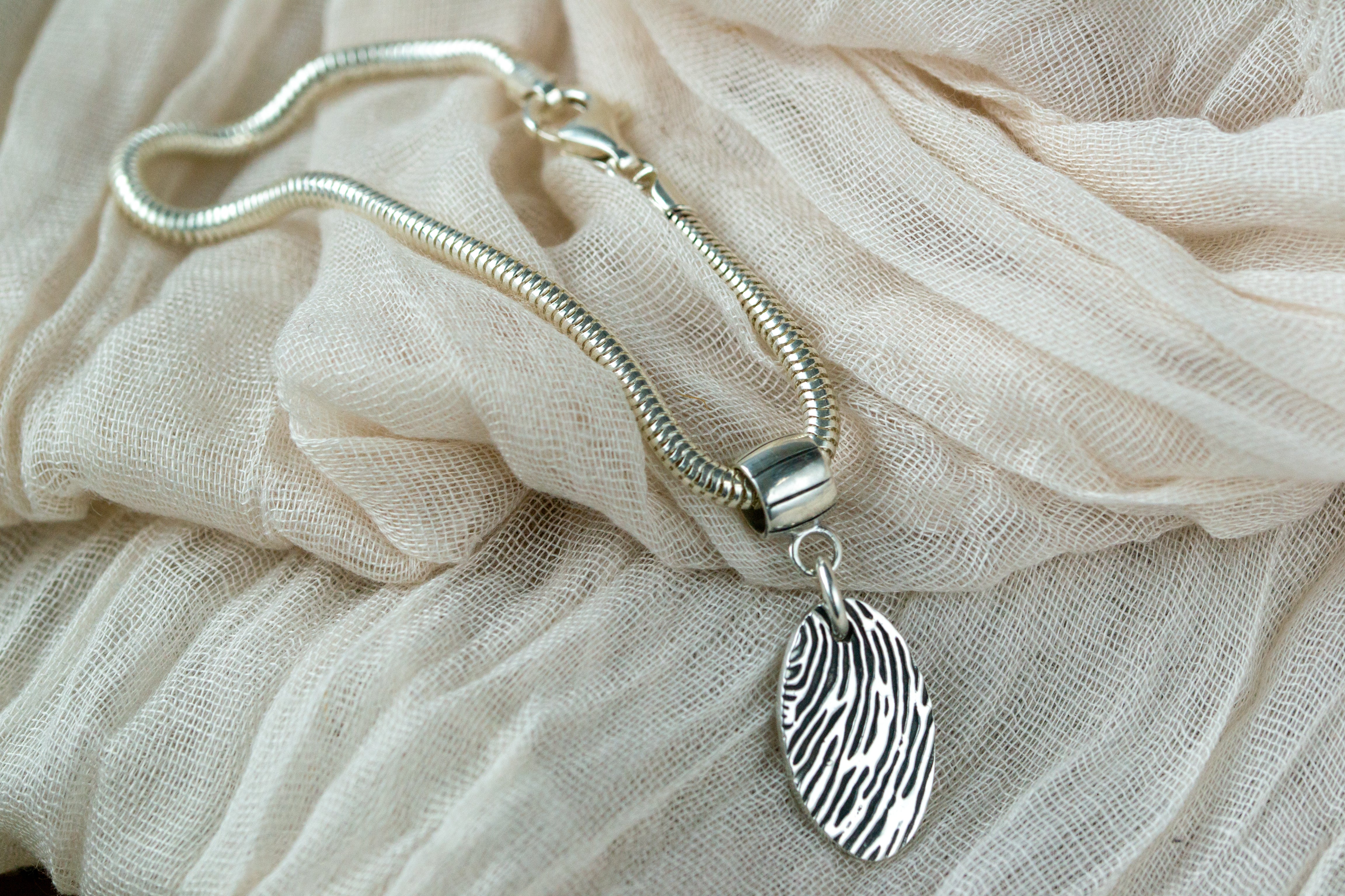 Capture the unique texture of a fingerprint on a sterling silver charm and showcase it on a silky snake chain bracelet. The charm attaches to the bracelet with a sterling silver carrier, which is also Pandora-compatible for added versatility. If you have an ink fingerprint, simply upload it with your order. If not, add an ink fingerprint kit to create your charm. Choose from a variety of charm shapes, and enjoy the option of having a name and age engraved on the back—everything included in the price! This elegant combination of fingerprint jewellery and high-quality craftsmanship makes for a truly special keepsake.