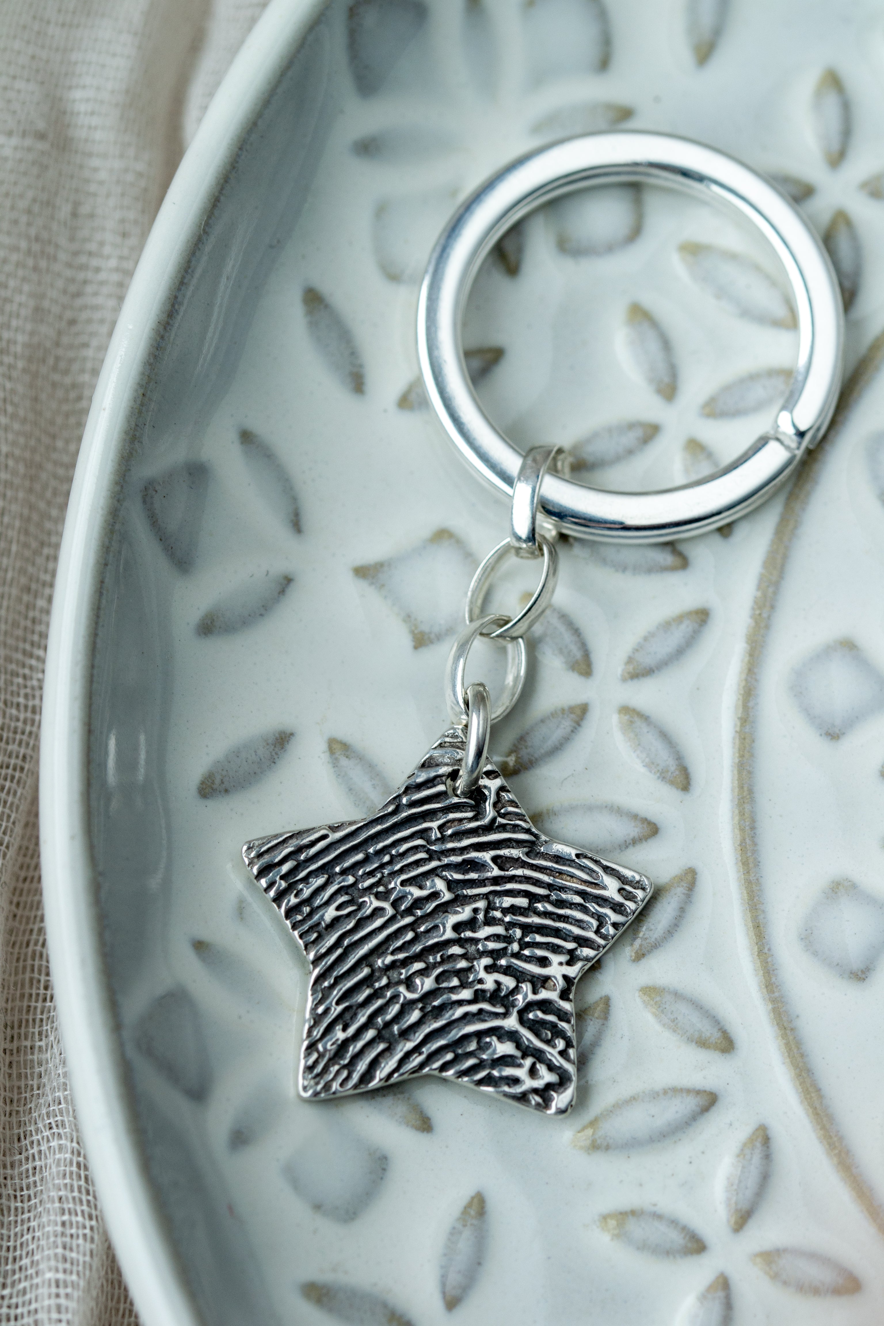 Feel the unique texture of an actual fingerprint, beautifully embellished on a sterling silver keyring. This charming keepsake isn't just for a child's print—it's a lovely way to keep a grown-up loved one close as well. If you have an existing ink print, simply upload it with your order. If not, include one of our ink print kits to send us your print later. We’ll capture the fingerprint in a shape of your choice, making it an ideal gift for both him and her. Each finished keyring includes hand-engraved personalization with a name and age on the back.