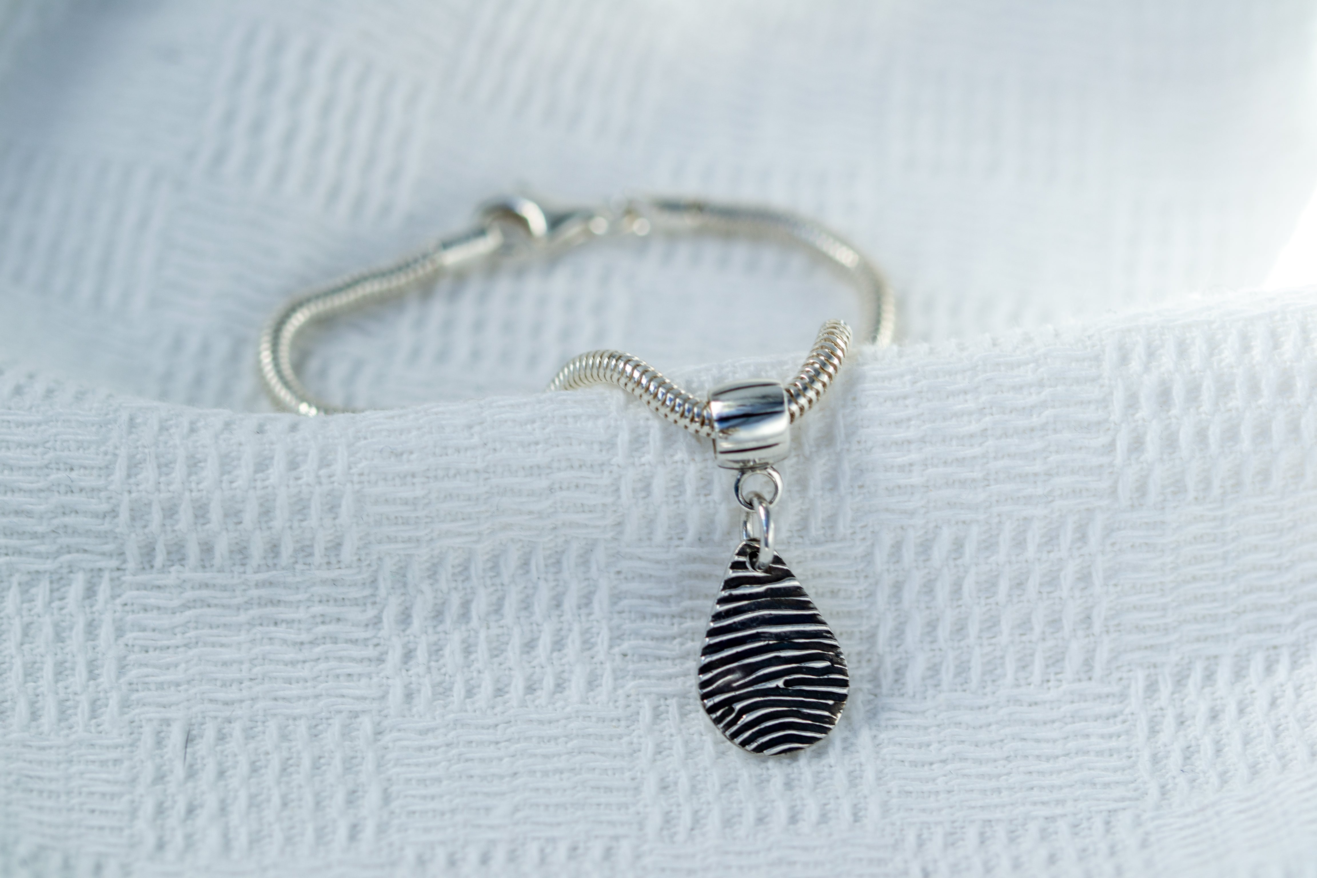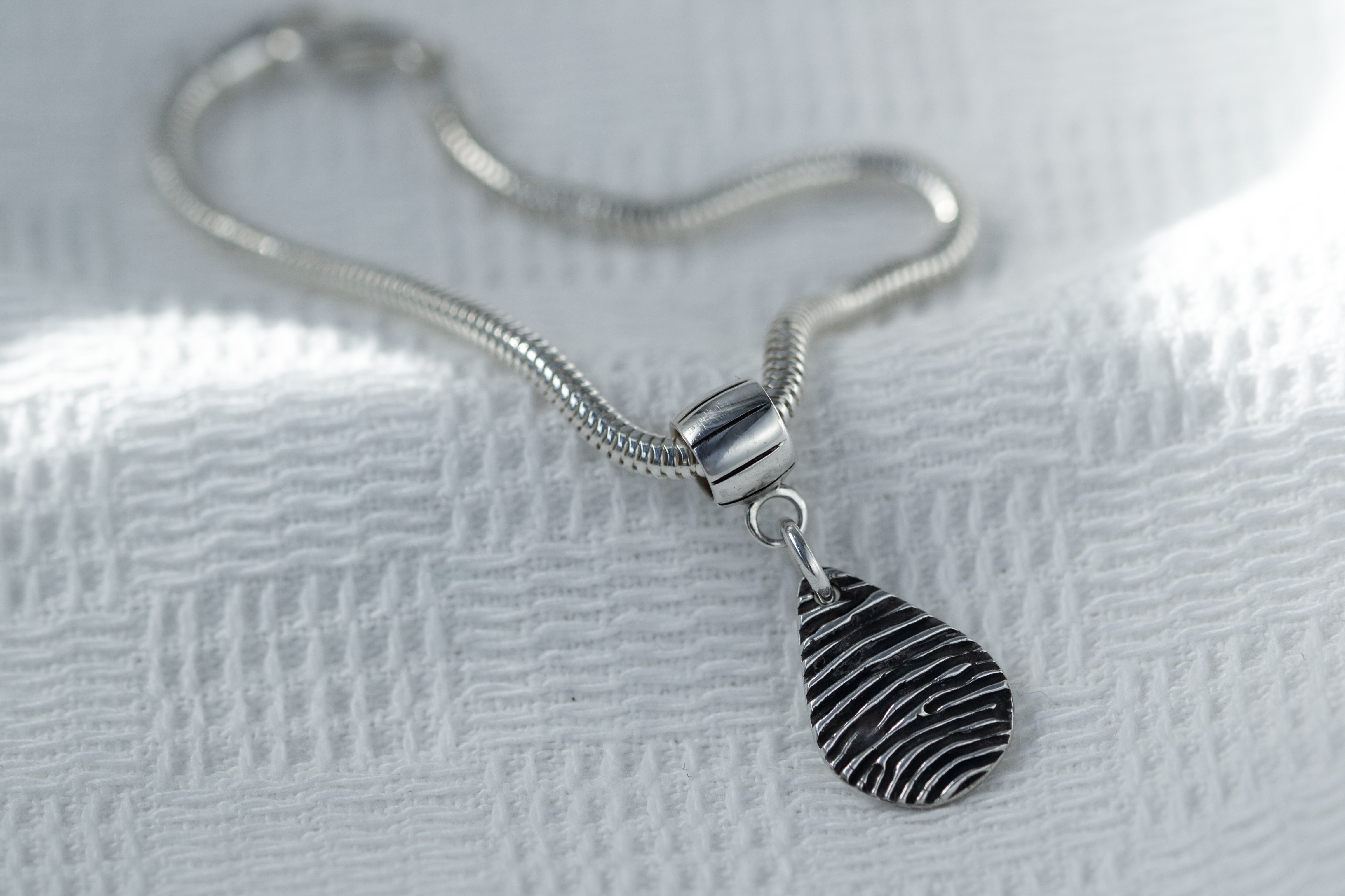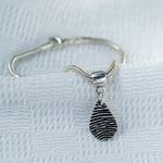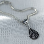 Snimite teksturu otiska prsta na privjesku od čistog srebra, a zatim ga pokažite na svilenkastoj narukvici sa zmijskim lancem. Vaš se privjesak pričvršćuje na narukvicu s nosačem od čistog srebra koji je također kompatibilan s Pandorom. Ako već imate otisak tinte, jednostavno ga prenesite uz svoju narudžbu. Ako nije, dodajte pribor za otiske prstiju s tintom. Birajte između raznih oblika privjesaka, a također imate mogućnost ugraviranja imena i godina na poleđini. Sve uključeno u cijenu!