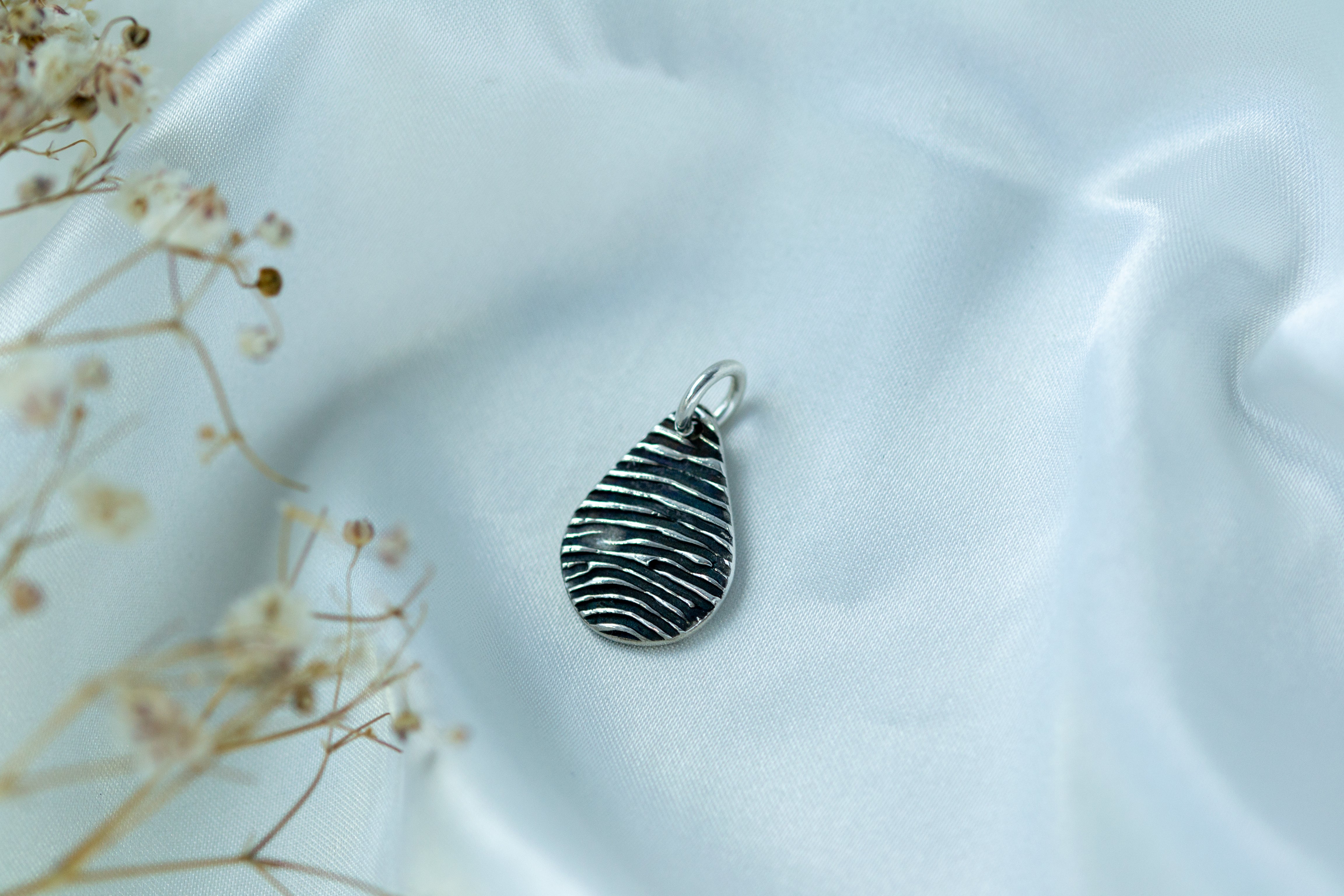 Jednostavno prekrasan dodatak vašoj kolekciji privjesaka. Osjetite teksturu stvarnog otiska prsta na srebrnom privjesku. I ovo nije samo za otisak vašeg djeteta... ovo je lijep način za sačuvati i odraslu osobu sebi blizu. Ako već imate otisak prsta od tinte, samo ga učitajte prilikom naručivanja nakita ili kupite naš pribor za uzimanje otiska tintom i naknadno nam pošaljite otisak. U ponudi imate nekoliko oblika privjesaka, a uz privjesak ćemo vam dati i srebrnu kopču kojom ćete ga moći pričvrstiti na svoju narukvicu ili naručite narukvicu iz naše ponude. Mi ćemo vam još ugravirati ime i dob osobe na poleđini privjeska što je uključeno u cijenu.