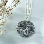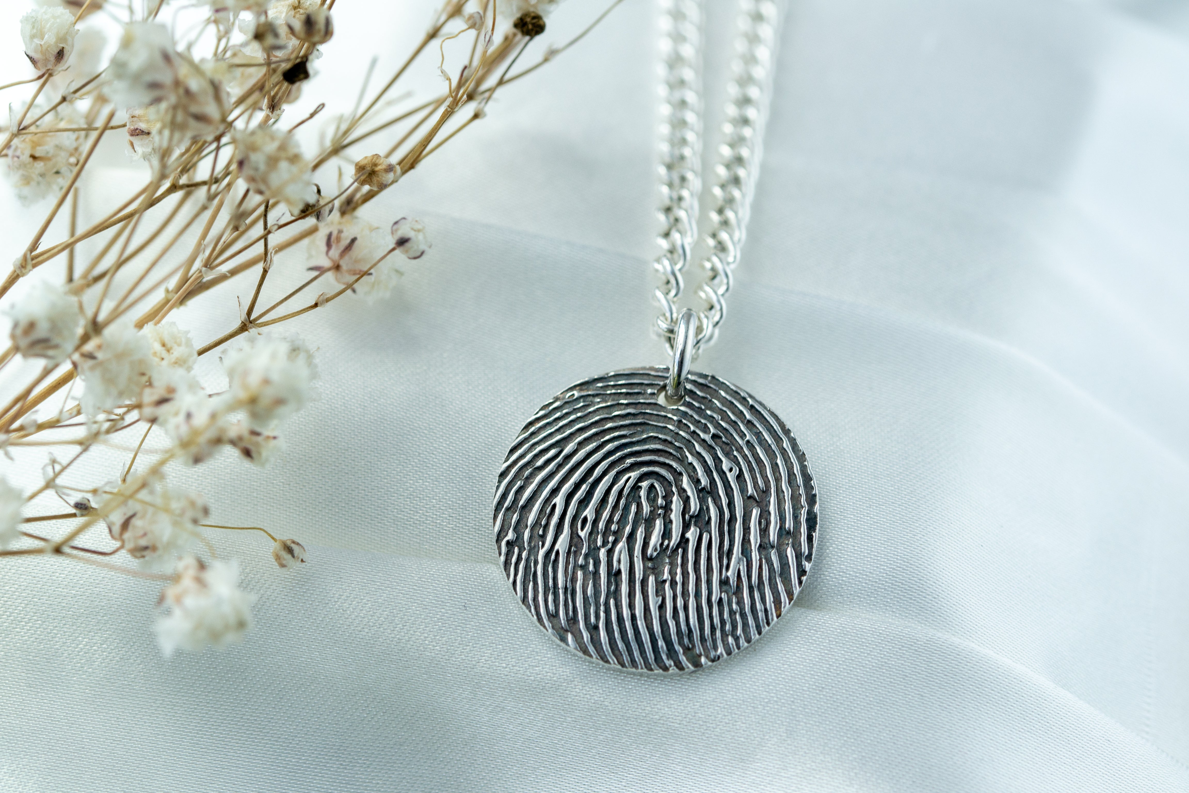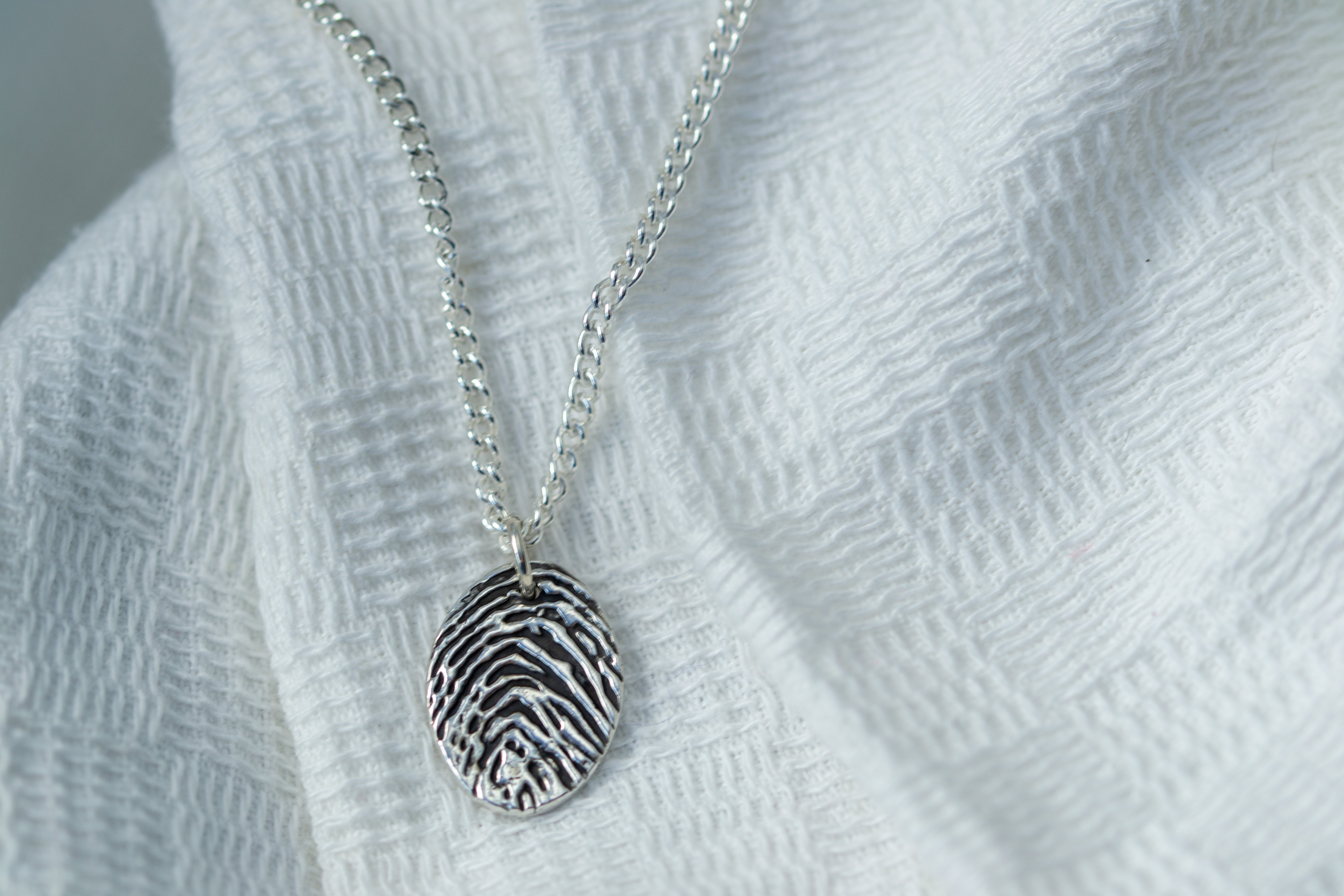 Preferirate dulji, elegantni lanačić kojim bi istaknuli unikatnu uspomenu? Osjetite teksturu pravog otiska prsta na privjesku od čistog srebra. I ovo nije samo za otisak vašeg djeteta... ovo je lijep način za sačuvati i odraslu osobu sebi blizu. Ako već imate otisak prsta od tinte, samo ga učitajte prilikom naručivanja nakita ili kupite naš pribor za uzimanje otiska tintom i naknadno nam pošaljite otisak. U ponudi imate nekoliko oblika privjesaka, a mi ćemo ugravirati ime i dob osobe na poleđini privjeska. Upotpunite privjesak jednom od naših srebrnih Curb ogrlica proizvedenih u Italiji, dostupnih u dvije veličine. I još uz to možete dodati i kamenčić rođenja. Savršeno!