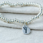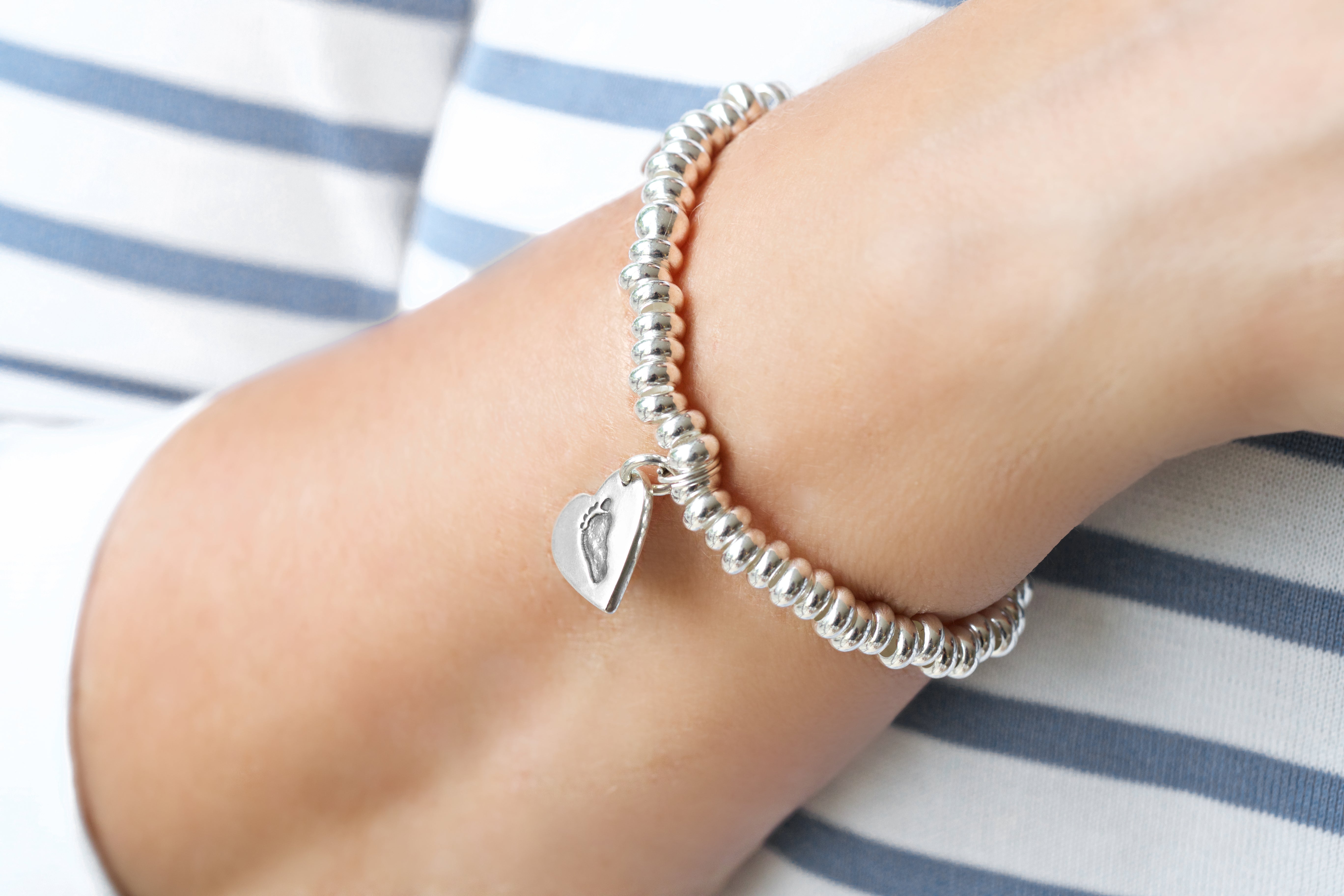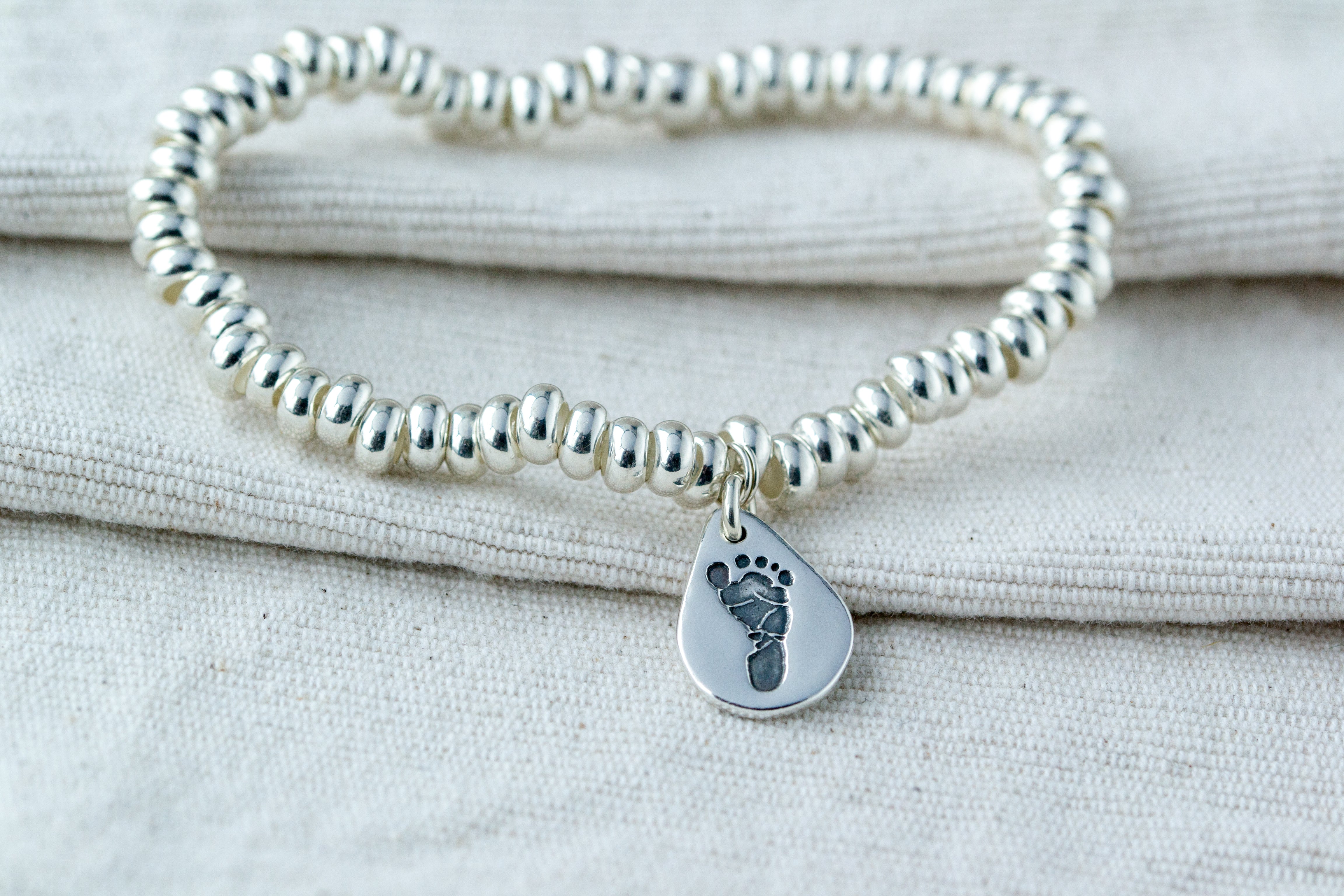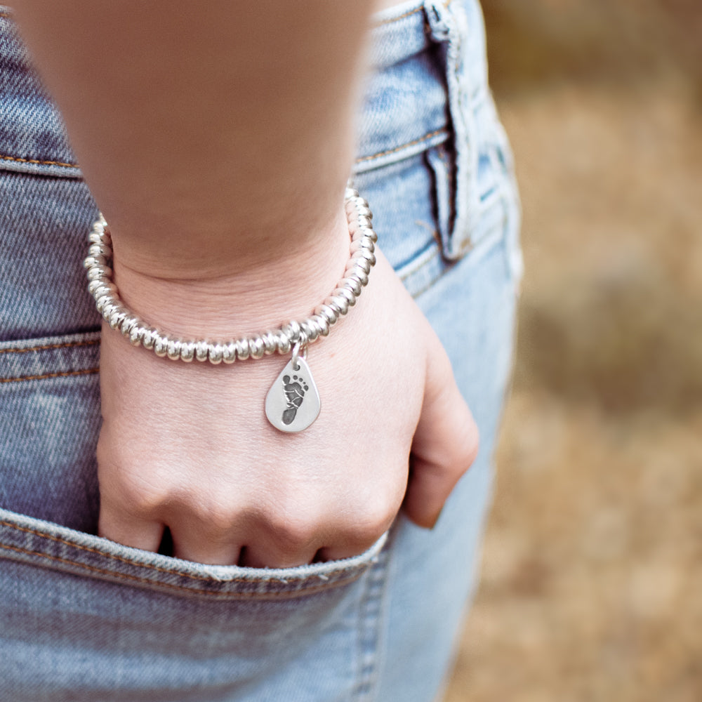 This stunning, chunky bracelet is the perfect way to keep those mini hands and feet close at all times. Ideal if you're ordering multiple pieces of hand and footprint jewellery or pairing with an existing item, this bracelet is crafted for the discerning buyer. Commissioned by Smallprint from Italy, it features sterling silver rings bound together by flexible nylon cord, allowing it to fit comfortably on nearly any wrist size. A truly elegant way to cherish those special prints!